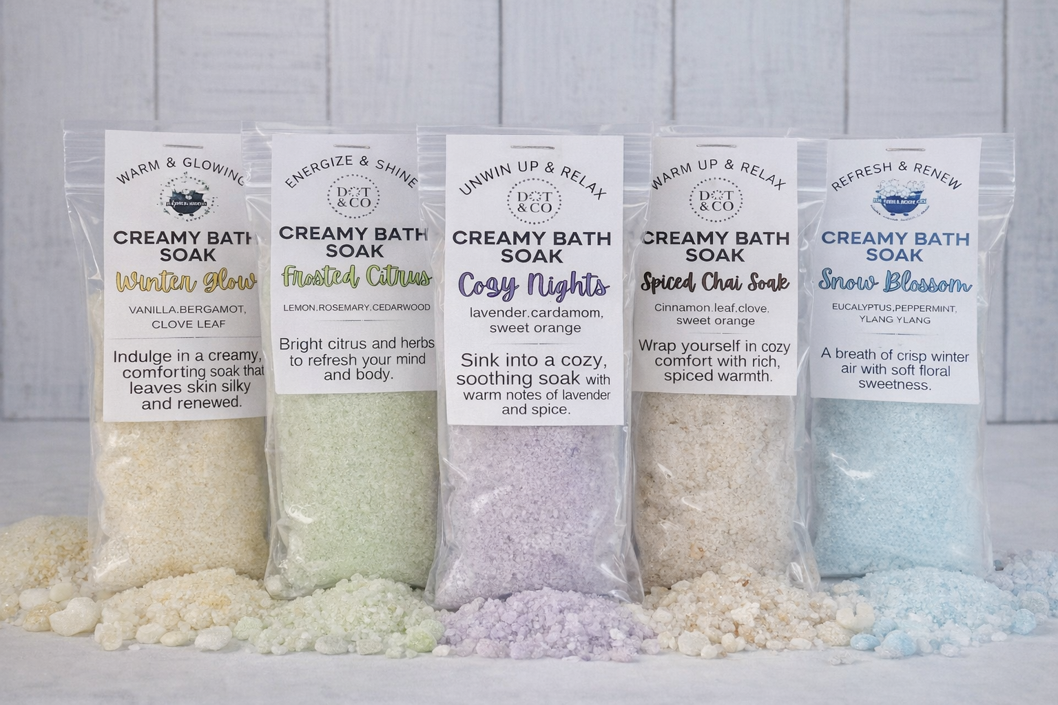 Ingredients: May contain: Epsom salt, sea salt, baking soda, coconut milk, Kaolin clay, milk powder, oats, mica, and essential oils